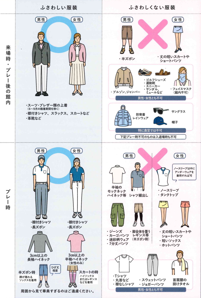 女性の丈の短いスカートやショートパンツ・スキニーパンツ等は禁止です。 |